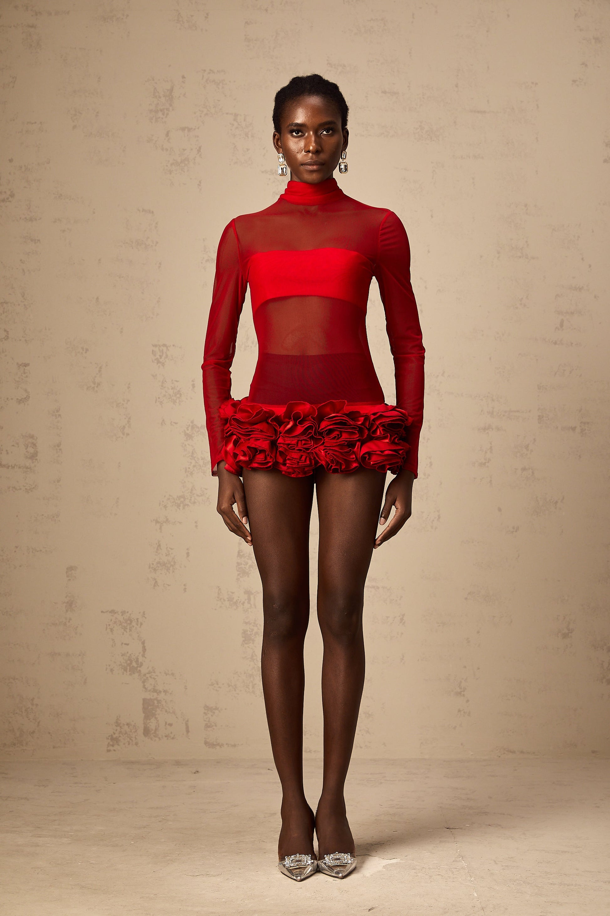 Zelie red 3d-petal semi-sheer tulle mini dress